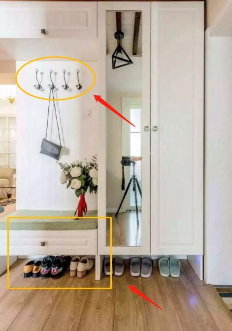 玄關鞋柜最新款式,可以用抽屜柜來取代換鞋凳。這樣的設計,可以讓我們收納更輕松,換鞋更加方便,上面的一排掛鉤也可以順手把衣服和包勾起來,實用又整潔。