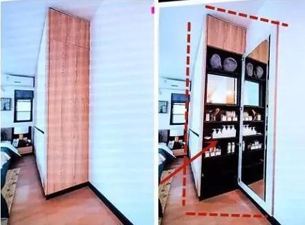 臥室的空間比較小,衣柜和床就把房間給填滿了。但是老婆的梳妝臺就沒有了。這個不用擔心,定制的衣柜側面可以往里挖10cm,這樣老婆的化妝品都可以擺放進去,在安裝上一個柜門,柜門里面也可以安裝一個全身鏡。